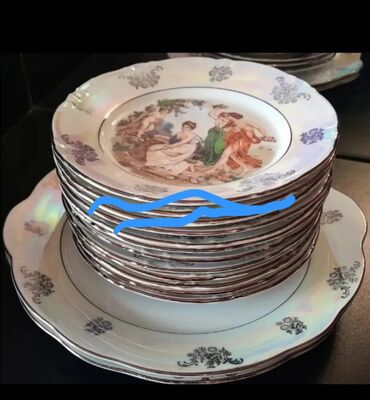 Qədim, 18 person yemək dəsti, Çexslovakiyanındır.Bütün predmetləri vardır sadəcə bir hissəsini görüntü üçün qoymuşam, digər hissələri bağlamadadır. Duz qabısından supnikinə qədər bütün predmetləri ...