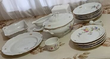 Porselen servis qabları dəsti - Material: keyfiyyətli porselen - Rəng: ağ, kənarları qızılı naxışlı - Dizayn: dalğalı kənarlar, bədii qızılı detallarla - Komplekt: müxtəlif ölçülü bir neçə servis ...