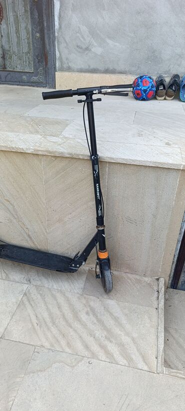 Şəhər içi hərəkət üçün praktiki iki təkərli skuter. Xüsusiyyətlər: - Tip: Mexaniki/skuter (elektrik mühərriki görünmür) - Rəng: Qara - Karkas: Alüminium ərintili gövdə, poldan aşağı platforma - Tə...