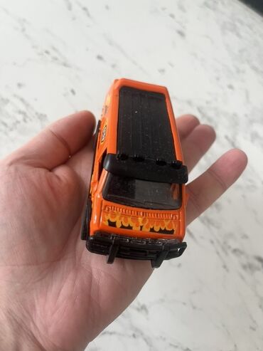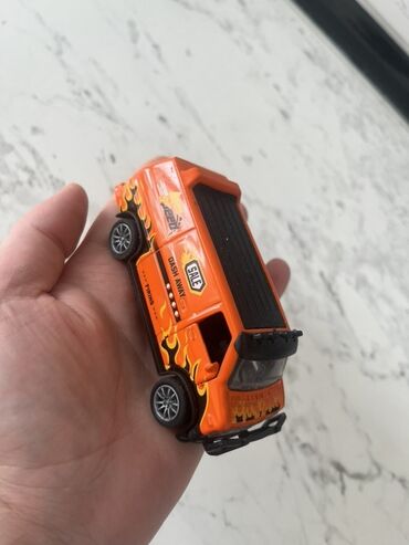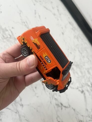 Oyuncaq miniatür maşın – narıncı rəngdə, “alov” temalı qrafik yapışdırmalarla. Yanlarında “SPEED”, “DASH AWAY” yazıları və qalxan formalı loqo var. SUV/van tipli kuzov, ön və arxa bamperdə qara off-road qoruyucular, qara dam paneli və şəffaf ön şüşə ilə gəlir. Sport tərzli diskli təkərlər asan yuvarlanır, hərəkətdə sabitlik verir. Qapı hissəsində detal vurğuları, ön hissədə alov naxışlı dekor. Kolleksiyaçılar və uşaq oyunları üçün ideal ölçüdə cib formatı. Rəngarəng dizayn, dinamik görünüş və sərbəst sürüşən təkərlər sayəsində trek və səthlərdə əyləncəli istifadə üçün uyğundur.