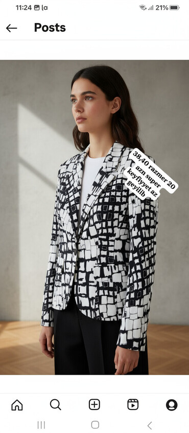 Qara rəngli klassik qadın blezeri. Yeni alinib 1dəfə geyinilib oversize modeldi ölçü m razmerdi ancaq çox bol durduğuna görə satılır. L Xl böyük bədənlərə daha uyğundu