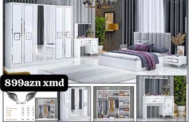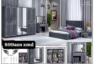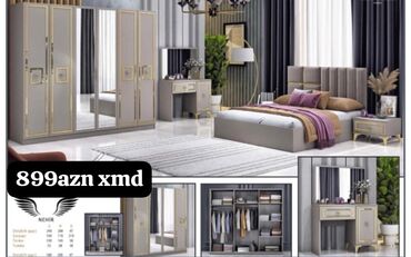 Yataq otağı dəsti Tərkibi: - 4 qapılı şkaf – iki aynalı orta qapı, dekorativ qızılı haşiyələr, asılqan və rəf bölmələri - Geniş çarpayı – yumşaq başlıq (kvadrat panellər, qızılı xətt detalı), alt ...