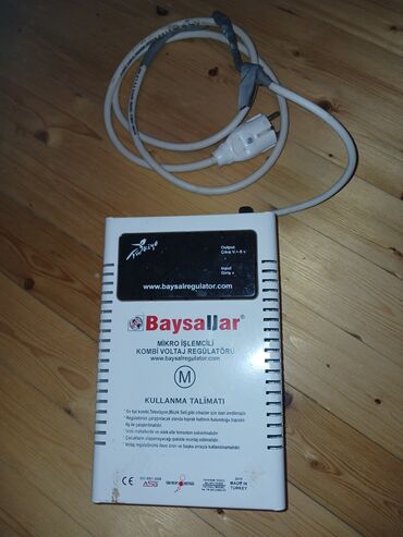 - Gərginlik tənzimləyicisi: Baysallar Mikro İşlemcili Kombi Voltaj Regülatörü (Model M). Giriş/çıxış göstəriciləri paneldə, 220 V şəbəkə üçün fişli kabel. Üzərində istifadə qaydaları və təhlükəsizlik xəbərdarlıqları qeyd edilib. ISO 9001:2008, Made in Turkey.