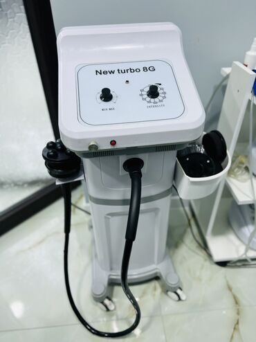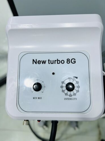 Komplektdə görünənlər: əsas aparat, qoşulan əsas şlanq/kabel, müxtəlif masaj/prosedur başlıqları və yan saxlama qabı. Üzərində “New turbo 8G” panel markalanması.