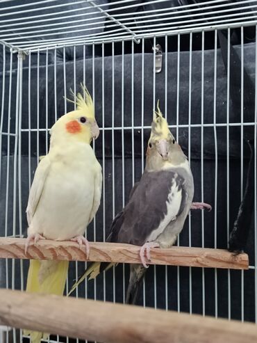- Rənglər: biri sarı/limon rəngli (lutino tipli görünüş), digəri boz-ağ qarışıq (normal/peyda rəng).