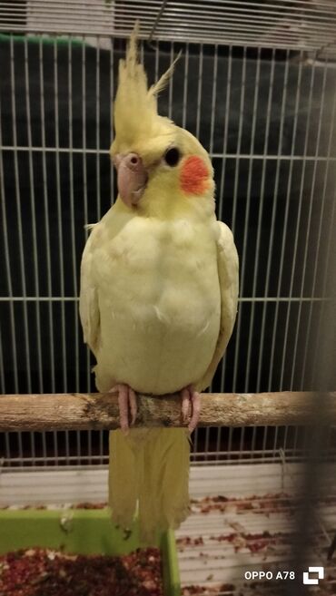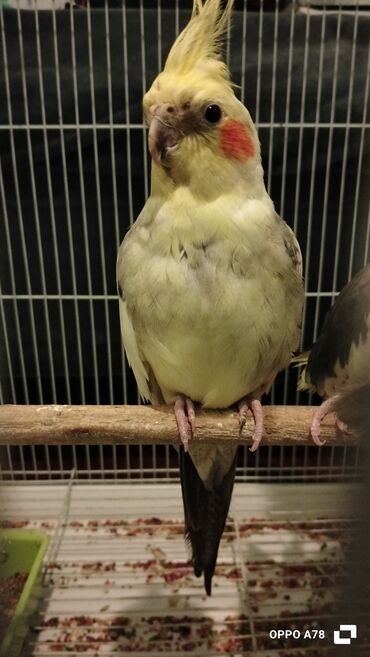 - Kafesdə saxlanılan, baş tükləri dik, yanaqlarında narıncı “yanaq ləkələri” olan nimfa tutuquşuları.