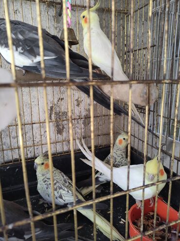 Nimfa tutuquşuları (Cockatiel cütlük) Sarı tək başına 50 Qara tək başına 30 Təsvir: - Kafesdə saxlanılan, baş tükləri dik, yanaqlarında narıncı “yanaq ləkələri” olan nimfa tutuquşuları. - Rən...