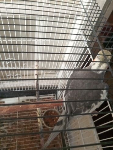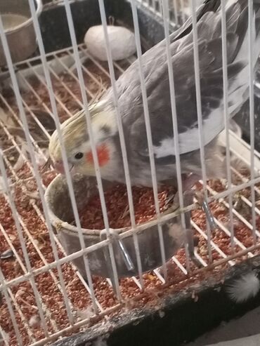 Nimfa tutuquşu (Cockatiel) – boz-ağ rəngli, sarı baş tükləri və yanaqlarda portağal ləkələri ilə. Uzun quyruqlu, başında tipik çələngi var. Şəkillərdə göstərilən qəfəsdə saxlanılır.