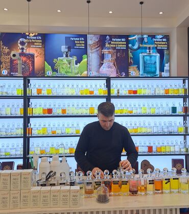 - Məkan: peşəkar parfümeri laboratoriyası üslubunda vitrin və arxa rəflərdə yüzlərlə nümunə ilə geniş seçim imkanı.