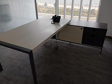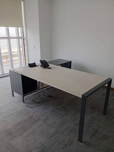 - Ayrı kabinetlə birlikdə rəhbər/menecer masası: eyni üslubda geniş stol və yanında tünd boz rəngdə çoxqapılı saxlama şkafı.