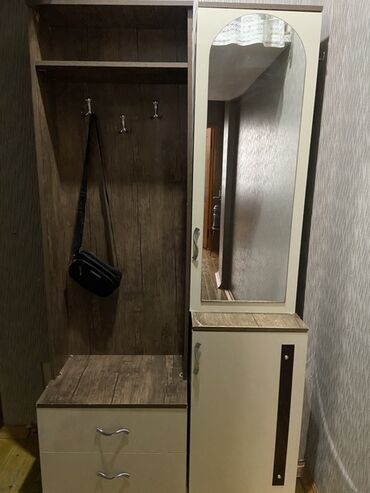 Bu dəhliz mebeli dəsti, giriş zonasını səmərəli şəkildə təşkil etmək üçün nəzərdə tutulmuşdur. Dəstə paltar asmaq üçün qarmaqlı açıq hissə, güzgü, aşağı hissədə iki siyirtməli oturacaq və əlavə saxlama üçün şkaf daxildir. Krem və tünd qəhvəyi rənglərin ahəngdar kombinasiyası ilə müasir interyerlərə uyğun gəlir. Praktik dizaynı ilə dəhlizinizi səliqəli və funksional edir.