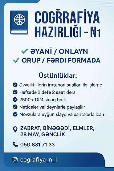 Coğrafiya MIQ/Sertifikasiyaya Hazırlıq Kursu - Həftədə 4 dəfə dərs - Hər dərs 90 dəqiqə - Dərslər 5 Apreldən başlayır - Əyani və onlayn formatda tədris - Son 3 aylıq proqramla ilin son qrupu - 3 a...