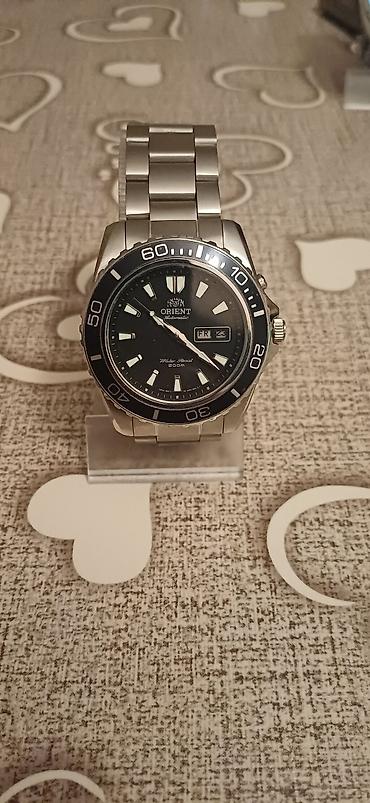 - Model 3: Orient Automatic dalğıc tərzi, qara siferblat, iri luminiscent indeks və əqrəblər. Bir tərəfə fırlanan bezel (0–60 markerli), “Water Resist 200 m” qeydli. Gün-tarix pəncərəsi, sağda tac və qoruyucu çıxıntılar, polad bilezik.