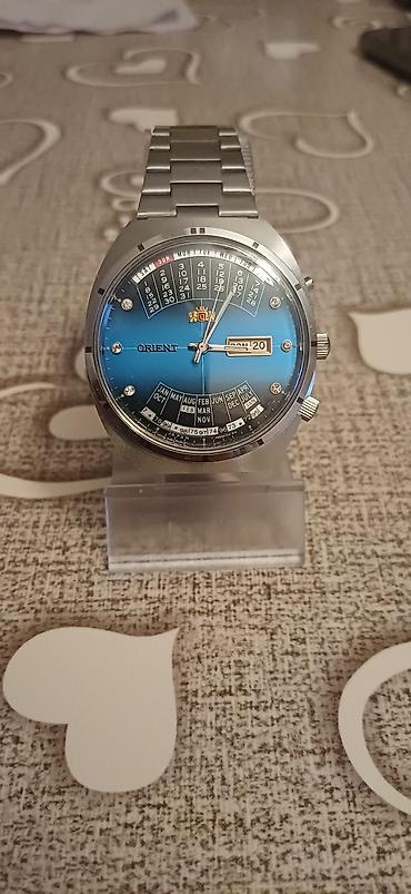 - Model 2: Orient Multi-Year Calendar, dairəvi polad korpus, mavi-qara siferblat keçidi. Üstdə həftənin günləri və tarix cədvəli, altda aylar üçün çoxillik təqvim diskləri. Gün-tarix pəncərəsi sağda, iki tac (funksiyaları idarə etmək üçün), metal biləkli.