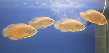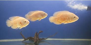 Akvarium üçün iri və rəngarəng yırtıcı balıqlar dəsti - Növ: Oscar (Astronotus ocellatus) – 3 ədəd. İkisi açıq krem/narıncı zolaqlı albino variansında, biri tünd (qara-yaşıl) fon üzərində narıncı ...