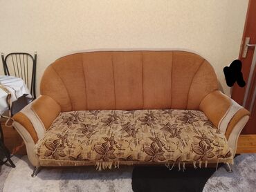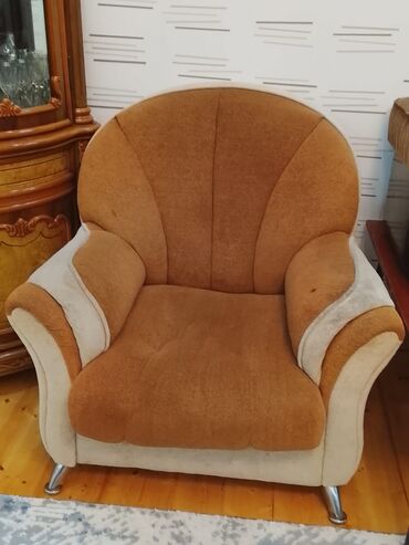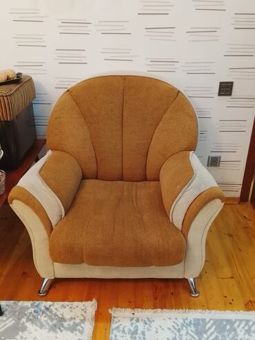 - Divan və kreslo: Eyni seriyadan klassik dizayn. Narıncı-bej parça kombinasiyası, relyefli bel hissəsi, yumşaq qol dayaqları. Xrom rəngli metal ayaqlar sabitlik verir. Divanın oturacaq hissəsində üzərində naxışlı örtük görünür.