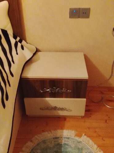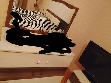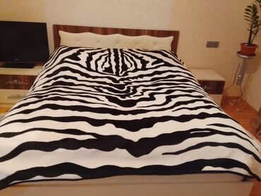 - Çarpayı: İki nəfərlik, taxta başlıqda zərif dekor xətti. Ağ-qara “zebra” naxışlı yumşaq örtü ilə təqdim olunur. Yanlarda uyğun tonda tumba/komod elementləri görünür.