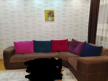 - Künc divan: L formalı, qəhvəyi rəngli yumşaq parça üzlü. Geniş oturacaq sahəsi, yumru künclər və aşağı profilli qol dayaqları. Çıxarıla bilən iri dekorativ yastıqlar (çəhrayı, göy, bənövşəyi tonlarda) dəstlidir. Ailəvi istirahət və qonaq qəbuluna uyğundur.