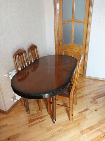 0553446146 ( WhatsApp) Yemək masası və 4 ədəd stul dəsti. - Material: laklı tünd qəhvəyi ağac karkas, massif görünüşlü taxta üstlük. - Masa: oval formalı, qalın parlaq üst səth, dekorativ əyri aya...