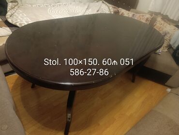Oval masa- Yemək/stol dəsti: oval formalı tünd rəngli taxta stol. Üst lövhə yumşaq radiuslu kənarlarla, dörd əyri ayaqlı konstruksiya. Ölçü: 100×150 sm.