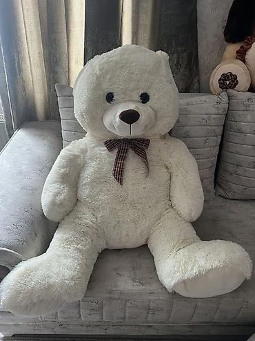 - Böyük ağ ayı: klassik model, boynunda xallı/qara-qırmızı qalstuk, ekstra böyük ölçü – divanda tam oturan hündür fiqur.