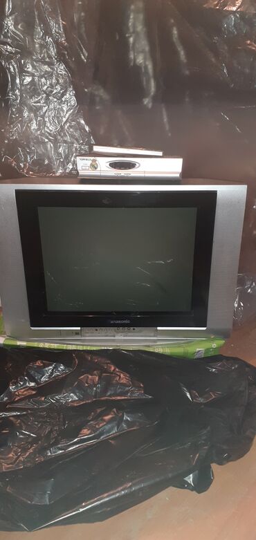 Panasonic kineskop televiziya, 17 düym ekran. Üstündə orijinal pultu var. Ön paneldə idarəetmə düymələri (açma/söndürmə, səs, kanal dəyişmə və menyu). Sağ-sol tərəflərdə daxili dinamiklər. Ön hissə...