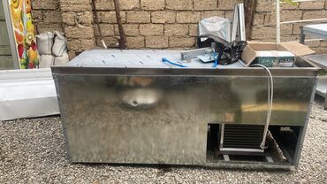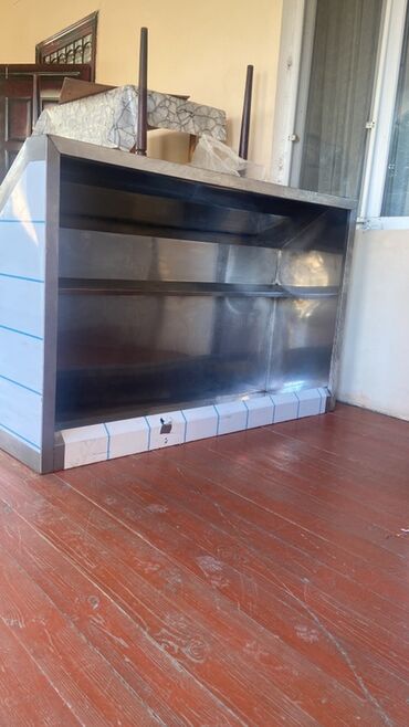 - Üst rəf/vitrin korpusu: paslanmayan poladdan hazırlanmış geniş vitrin/servis bloku. İçəridə iki səviyyəli rəf sistemi, ön tərəfdə məhsulların təqdimatı üçün açıq zona. Masa arxası servis və ya bufet xətti kimi istifadə oluna bilər.