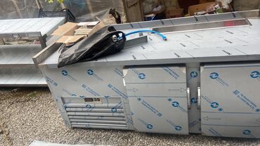 - Soyuducu iş masasının inteqrasiyalı modeli: ön paneldə elektron idarəetmə bloku, aşağıda ventilasiyalı kompressor bölməsi, sürüşən iki qapılı soyuducu bölmə. Üst hissə paslanmayan polad iş səthidir; sağ tərəfdə uzunlamasına vanna/küvet üçün açıq yuva (GN qablar üçün uyğundur). Səthdə sıçramaq əleyhinə arxa bort var. Qida istehsalı, fast‑food, kafe və restoran mətbəxləri üçün ideal.