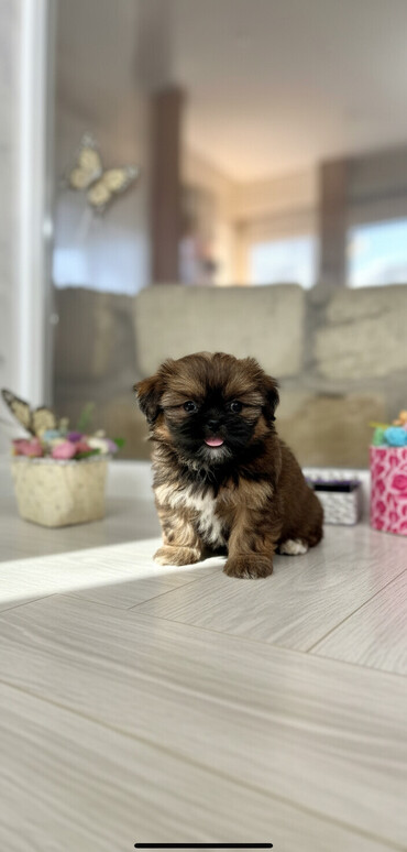 Pekines balası – 2 aylıq, xırda ölçülü, qəhvəyi-şabalıd rəng çalarları və sinəsində ağ ləkə. Qısa burunlu, qalın və yumşaq tüklü, iri ifadəli gözlər. Ev şəraitinə uyğun, sakit və mehriban cins. Qurd dərmanı verilib. Gündəlik gəzinti və oyun üçün əlverişli, az yer tələb edir. Şəhər mənzilində saxlanılmağa uyğundur, ailələr və uşaqlarla rahat ünsiyyət qurur. Balaca ölçüsünə baxmayaraq ayıq-sayıqdır, təlimə meyllidir.