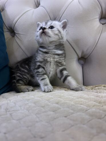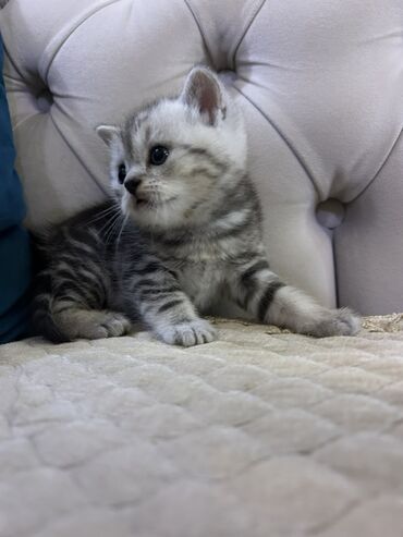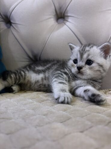 Başlıq: Britan Şorthair Pişik Balaları Təsvir: - Cins: British Shorthair - Rənglər: gümüş tabby və ağ/gümüş - Yaş: fotolarda görünən eyni bala dəsti Görünüş: - Gümüş tabby: kürək və ayaqlarda tün...