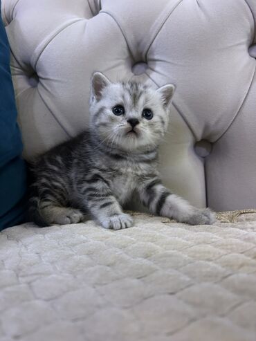 Britaniya (British Shorthair tipli) balası – gümüşi-boz rəng çaları, yumşaq sıx tük örtüyü və iri mavi-boz gözlər. Dəyirmi baş quruluşu, qısa qulaqlar, güclü pəncələr və kompakt bədən forması ilə s...