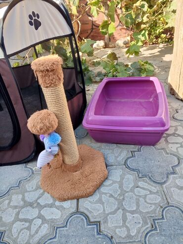- Qaşıma dirəyi: sisal iplə sarınmış sütun, altlığı sabit, üzərində asma oyuncaq aksesuarları var. Dırnaq itiləmək və enerji boşaltmaq üçün.