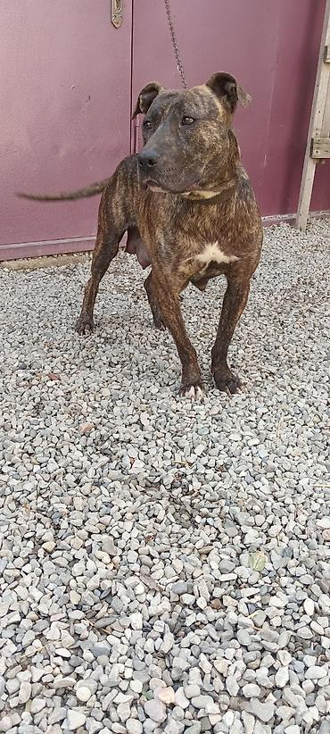 Brindle rəngli, güclü bədən quruluşuna malik it. Qısa tüklü, iri döş qafası və əzələli ayaqları ilə aktiv həyatı sevənlər üçün uyğundur. Ağızlıq və möhkəm metal ilgəkli mavi qayışla göstərilib. Ayı...