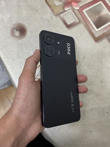 POCO smartfon - Rəng: Qara, mat teksturalı arxa qapaq - Arxa kamera bloku: 2 obyektiv + əlavə sensor/LED modul - Arxa hissədə “POCO” loqosu və “CE” nişanları - Korpus: düz kənarlar, iki böyük dair...