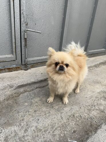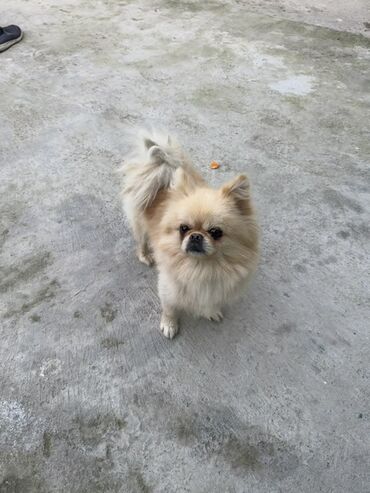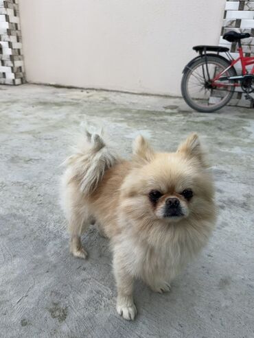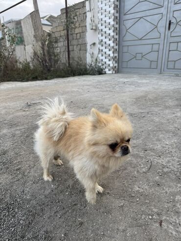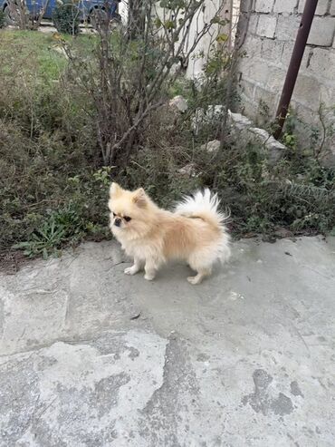 Pomeranian (Spitz) balası – kiçik ölçülü, yığcam və çox şirin tüklü it. Şəkillərdə görünən it: - Rəng: krem–şaftalı qarışıq, ağ quyruq tükləri ilə - Xəz: qalın, yumşaq, bol yalı və tüklü quyruq - ...