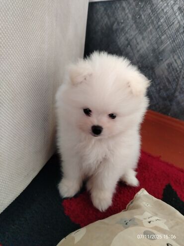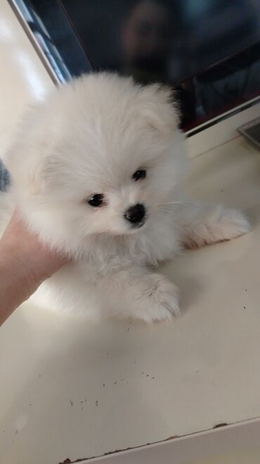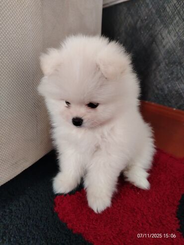 Pomeranian (Spitz) balası - Rəng: qar kimi ağ - Yunu: çox sıx, ipək kimi yumşaq, qalın alt tüklü - Burnu: qara, kiçik və yumru - Qulaqlar: balaca, dik formaya keçəcək - Gözlər: tünd, ifadəli - Bəd...