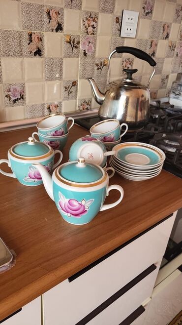 Bu zərif farfor çay dəsti dərin göy rəngdə və qızılı detallarla bəzədilmişdir. Dəstə qəhvədan, altı fincan, altı nəlbəki, şəkər qabı və süd qabı daxildir. Hər bir parçada mürəkkəb qızılı naxışlar v...