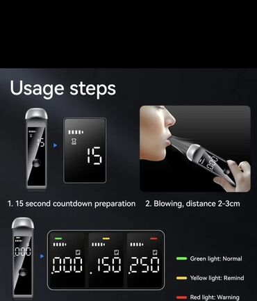 - İstifadə qaydası: 15 saniyəlik hazırlıq mərhələsindən sonra 2–3 sm məsafədən ağızdan üfürün; nəticə dərhal ekranda görünür.