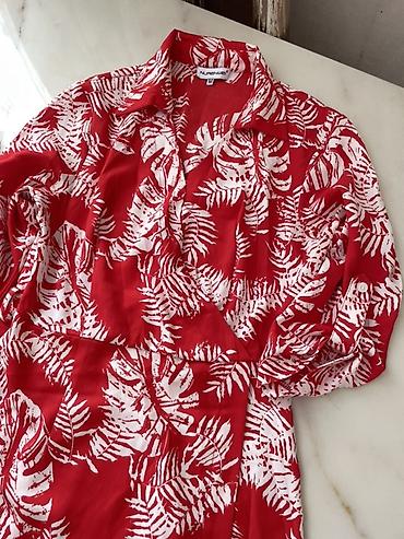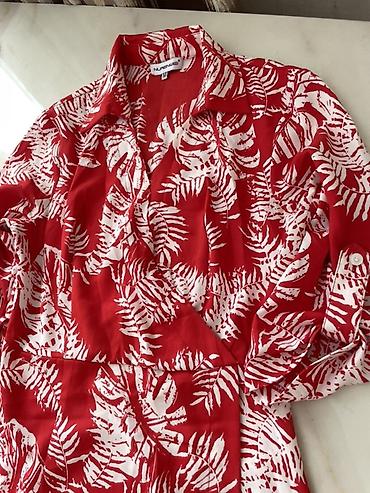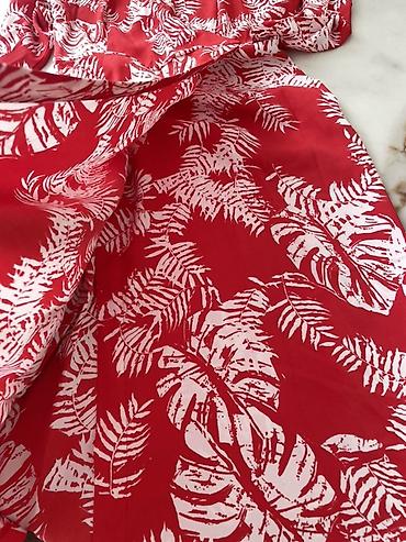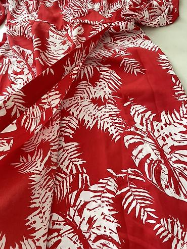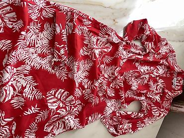 - Rəng və naxış: Parlaq qırmızı fon üzərində ağ tropik yarpaq printi