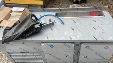 - Soyuducu iş masası: üstü paslanmayan polad, üst hissədə uzun servis vanna bölməsi (GN qablar üçün uyğundur), yan tərəfdə elektron temperatur göstəricisi və idarəetmə paneli, aşağıda sürgülü/qatlanan qapılı soyuducu bölmələr, ön hissədə havalandırma qəfəsi. Kompressor və elektrik bağlantısı üçün çıxışlar hazırdır.