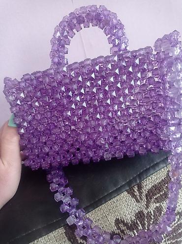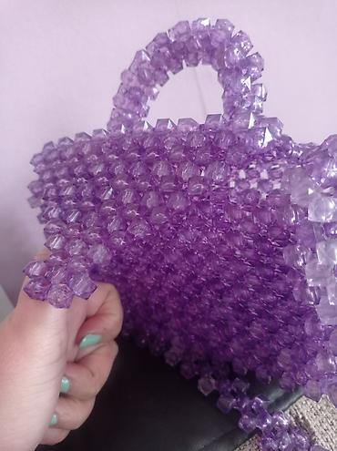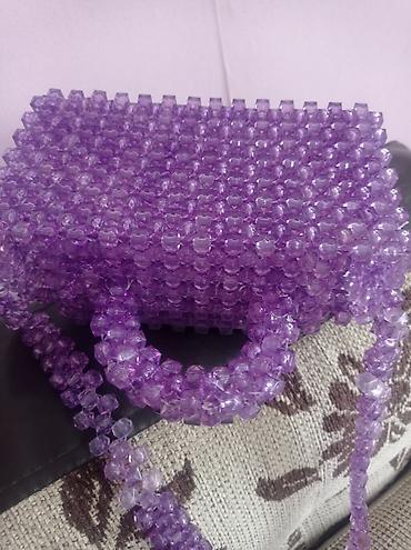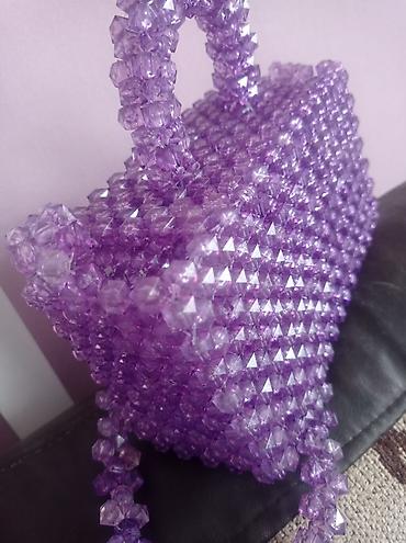 Bənövşəyi rəngli, tamamilə muncuqdan hazırlanmış çanta. - Material: parlaq akril muncuqlar, möhkəm balıqçı ipi ilə hörülüb - Dizayn: əl tutacağı və krossover taxmaq üçün uzun muncuq qayışı - Qayış ...
