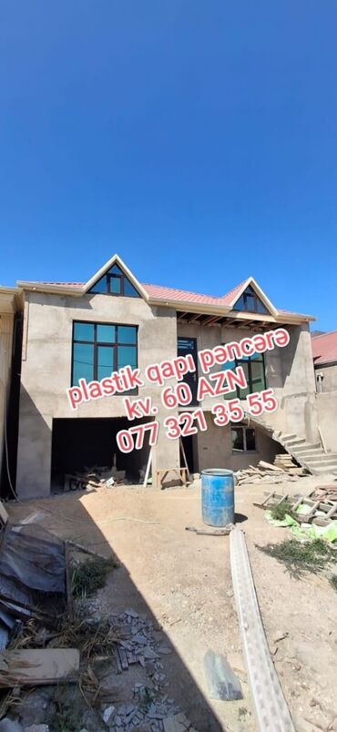Şəkillərdə müxtəlif ölçü və dizaynlarda hazır qapı-pəncərə blokları və montaj nümunələri göstərilir.