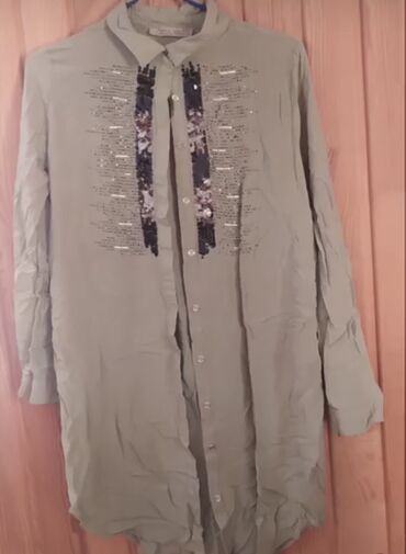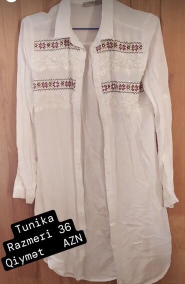 Qadın tunik köynək - Rəng: tünd göy - Model: uzun tunik-köynək, önü tam düyməlidir - Yaxa: klassik yaxa - Naxış: sinə hissəsində kontrast ağ və qırmızı çiçəkli güpür/sapla işləmə, V formalı bəzək ...