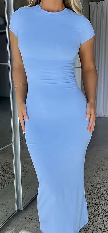 Mavi rəngli qadın maxi paltar