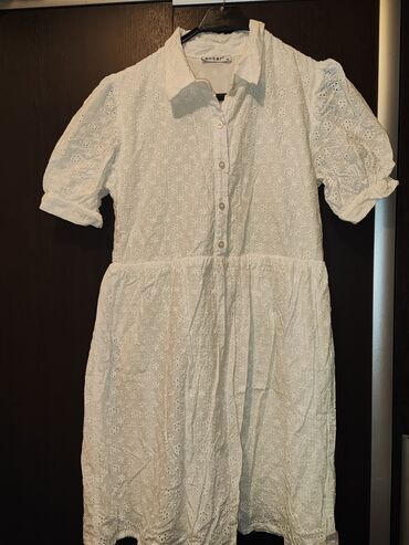 Ağ rəngli, krujeva naxışlı yay donu. - Material: pambıq əsaslı broderiya (ağ ipəkvari deşikli naxışlarla). - Model: beldən yığmalı A-kəsim, dizə qədər uzunluq. - Yaxa: V-yaxa, ön hissədə dekorat...