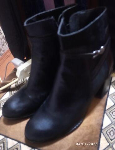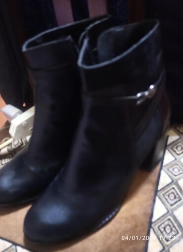 Qadın botları – qara rəng.Razılaşma yolu ilə satılır.1dəfə geyinilib.Səhv razmer seçiminə görə satılır - Model: qısa boğazlı, klassik sivri burun - Material: hamar, parlaq üst material (eko‑dəri g...
