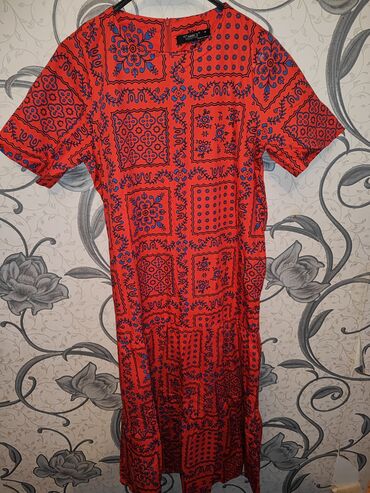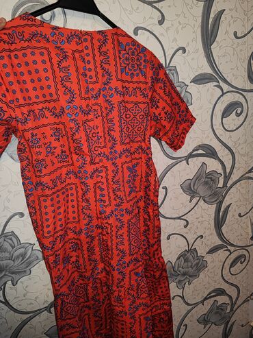 Qırmızı rəngli, yarpaq printli uzun yay donu. - Ölçü: S - Qiymət: 62 AZN (şəkildə göstərilib) - Model: kvadrat yaxalı, qısa həcimli (buf) qollar, beldən yığılmış, pilləli ətək kəsimi - Parça: yüngü...
