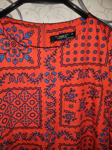 Qadın geyimi – etnik naxışlı yaylıq stilində don - Model: dizə qədər uzunluqda, qolsuz, yuvarlaq yaxalı - Parça: yüngül, axıcı toxuma; isti havalar üçün rahat - Dizayn: narıncı əsas fon üzərində ş...