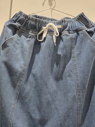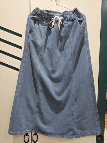 Denim yubka - Model: düz kəsimli, diz-altı/ midi uzunluq - Material: klassik mavi jeans (yüngül solğun effektli) - Ön hissədə düyməli-zipli bağlanma - 5 ciblə: iki ön, iki arxa, bir kiçik saat cib...