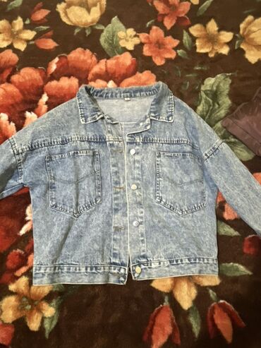 Denim ceket – həcimli kəsim - Rəng: açıq mavi denim, arxada kontrast tünd-mavi iri forma (ürəkvari görünüşlü panel) - Kəsim: oversize/sərbəst siluet, düz enli çiyinlər - Bağlanma: ön hissədə metal...